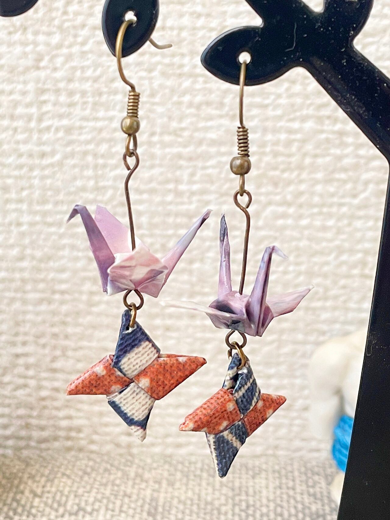 折り鶴は普通の折り紙ですが、手裏剣はぬの紙を使用しているので通常よりも厚みがあります。通常よりも細めのピンを使用しているので、優しめの取り扱い推奨。